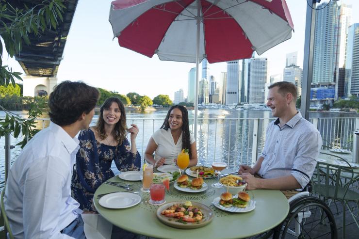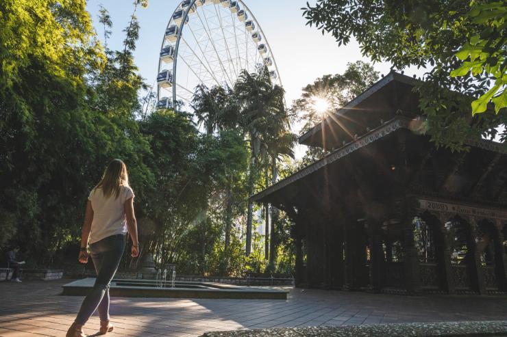 乘坐 60 米高的布里斯班摩天轮(Wheel of Brisbane),可以 360 度欣赏这座城市的市区景观和更远处的景色。一天当中任何时候都能欣赏到美景,但 Sky High Sunset Session 会为游客提供自选饮料,让你能够在日落时分,对着金色的夕阳干杯。