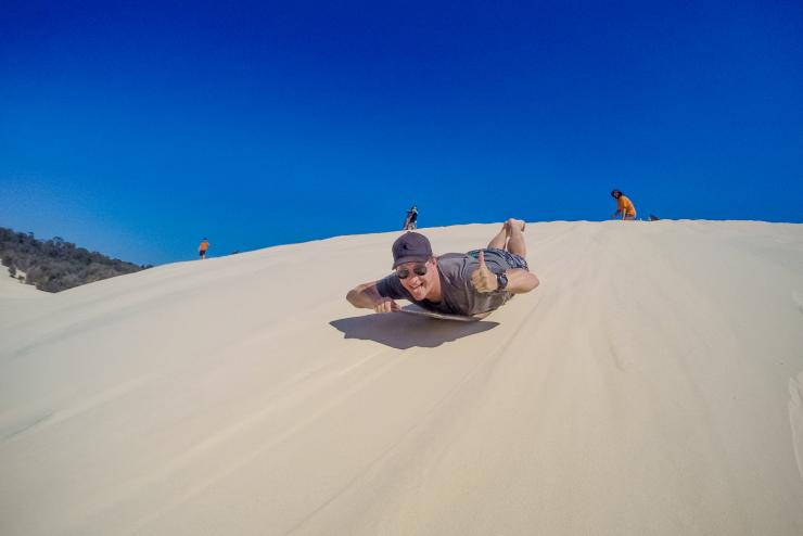 在天阁露玛沙漠(Tangalooma Desert)一日游期间,你可以乘坐滑沙板从巨大的沙丘上呼啸而下,一路伴随着欢声笑语。前往沙漠的路途也是乐趣所在,你可以感受四驱车在连绵起伏的沙丘上一路颠簸的体验。