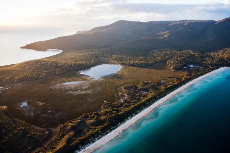 一路攀登爬上酒杯湾(Wineglass Bay)观景台,弧形的白色沙滩、绿林密布的地峡和蓝色的海水尽收眼底。从这里折返,或历时 4、5 个小时环绕可爱的哈泽德海滩(Hazards Beach)走一圈。
