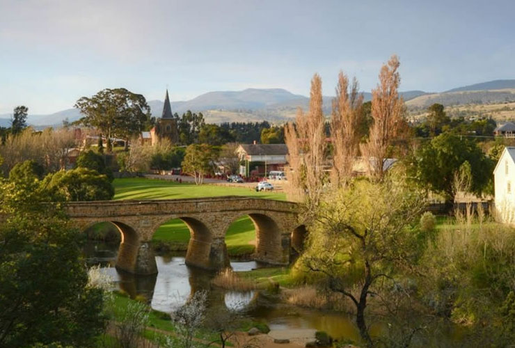 从霍巴特北上,不远处便是宁静的里奇蒙小镇(Richmond)。它仿佛时间被遗忘的一页,保留着十九世纪的模样。那座石砌的古桥,是澳大利亚最古老的拱桥,横跨着悠悠的河水,如同把人从现代引渡回旧日时光。鸭子在桥下踱步,小镇的教堂钟声悠然响起,仿佛连空气都慢了下来。