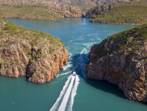 西澳大利亚州,金伯利,塔尔博特湾,俯瞰一艘船穿越两座岩石悬崖之间的水平瀑布,那里的水流蓝白色彩交织 © 澳大利亚旅游局版权所有