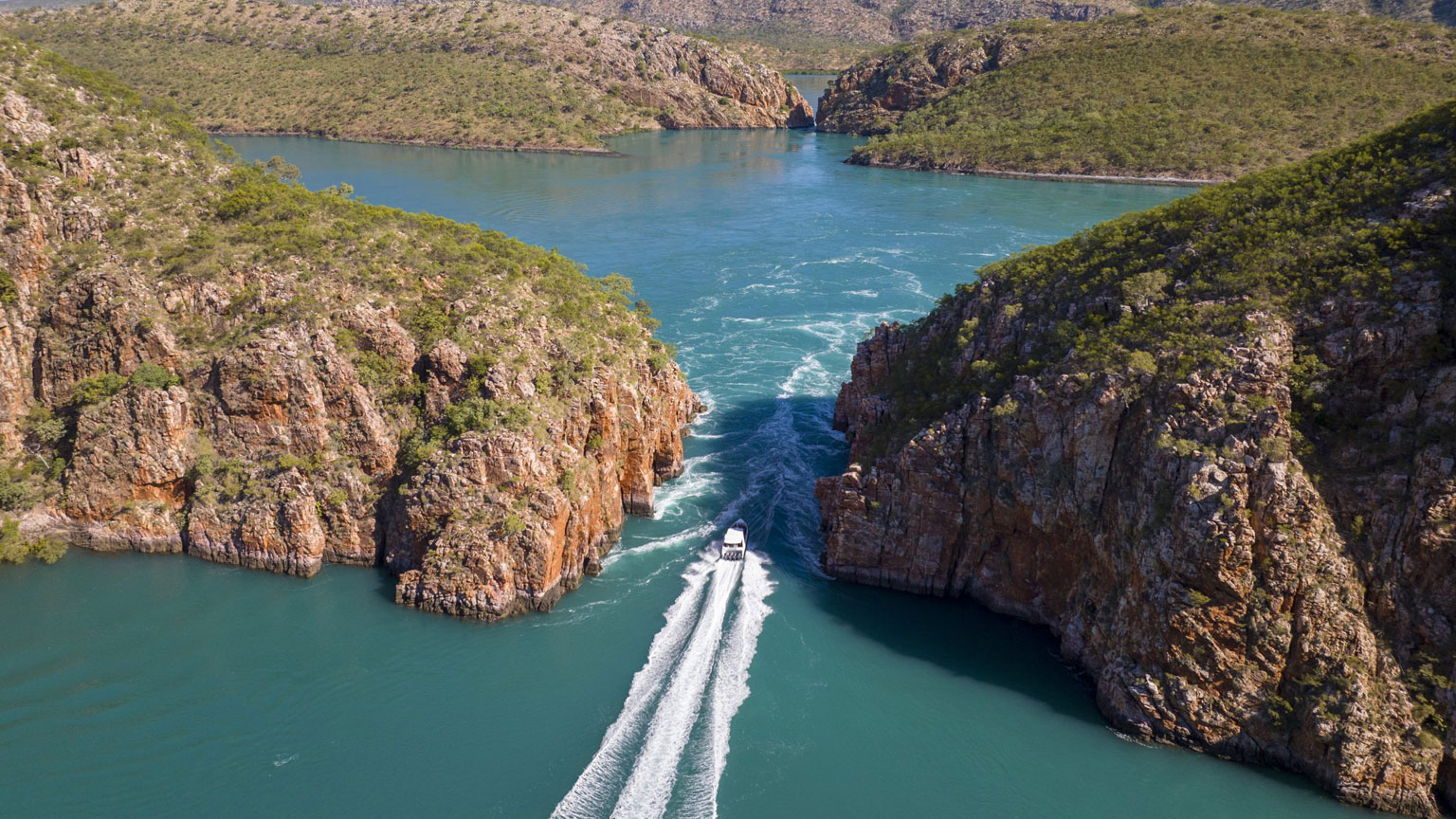 西澳大利亚州,东金伯利,埃尔奎斯特荒野公园,俯瞰一艘小船穿梭在深绿色的峡谷之中,旁边是橙色的峭壁岩石 © 西澳大利亚州旅游局版权所有