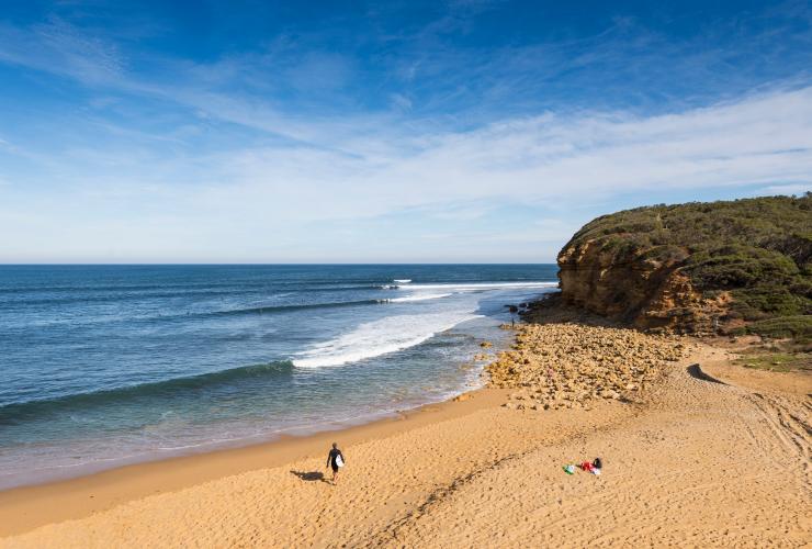 沿着维多利亚州令人惊艳的大洋路(Great Ocean Road)行驶,你会途经该州高品质的冲浪海滩之一。贝尔斯海滩(Bells Beach)距离墨尔本 1.5 小时车程,是贝尔斯海滩职业冲浪大赛(Rip Curl Pro Bells Beach)的赛场所在地。这项冲浪比赛吸引了来自世界各地成就最高的冲浪选手。海滩周围是岩石悬崖,登上崖顶可以一览下面的沙滩。