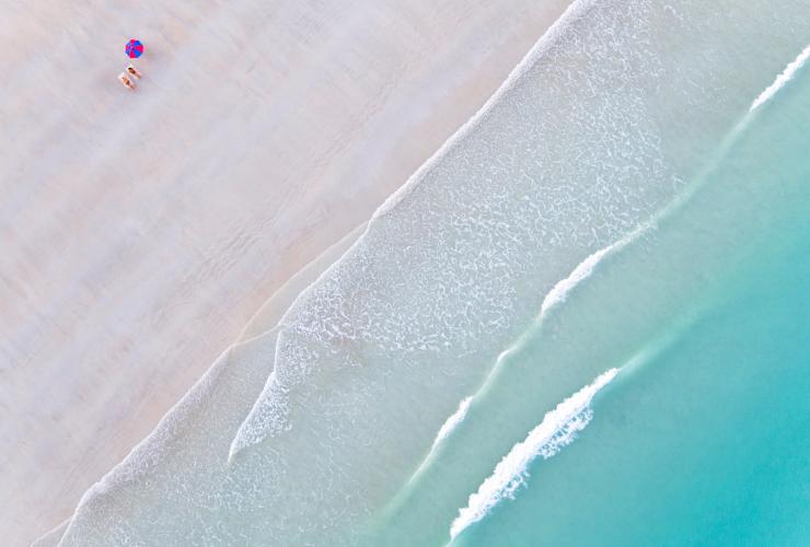 毫无疑问,在昆士兰州一系列景色壮观的海滩中,最著名的当属白天堂海滩(Whitehaven)。白天堂海滩位于迷人的圣灵群岛(Whitsunday Islands),清澈蔚蓝的海水浅吟低唱着漫上洁白耀眼的沙滩。你可以在漫游圣灵群岛时,造访这片海滩,也可以住在汉密尔顿岛(Hamilton Island)上,并坐 30 分钟游船来这里。
