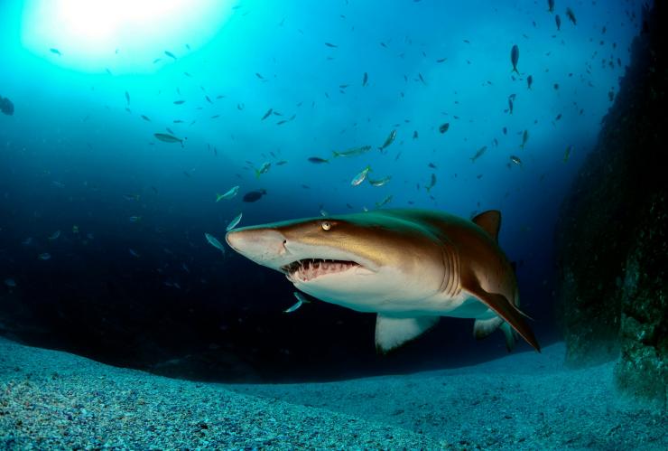 豪勋爵岛(Lord Howe Island)每次只允许 400 名游客上岛,因此,这几乎可以保证你能独享这里的潜水胜地。乘坐豪勋爵岛潜水公司(Dive Lord Howe)提供的游船,可以到达波尔斯金字塔(Balls Pyramid)嶙峋外露的火山岩处,这里以丰富的海洋生物而闻名,其中包括澳大利亚境内绝无仅有的大群加拉帕戈斯真鲨(Galapagos Whaler Shark)。在这里,你还可以探索布满岩石柱和礁石的洞穴,见到通常只会在 100 多米深的深海出没的百灵娜天使鱼(Ballina angelfish)。