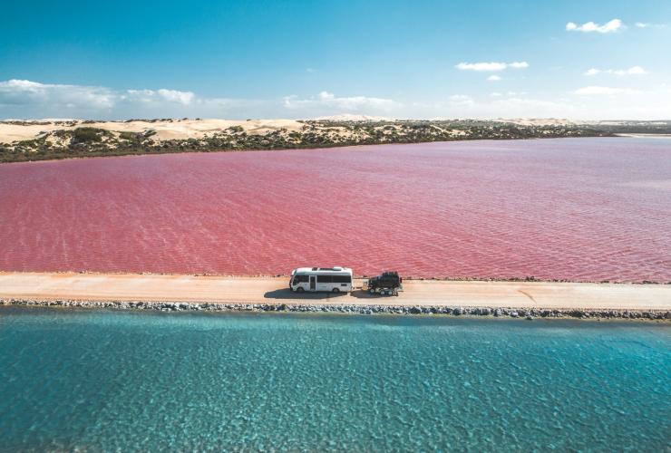西澳大利亚州的珊瑚海岸(Coral Coast)拥有澳大利亚一些最绚丽多彩的自然奇景,比如红色的悬崖和浅蓝色的海水,并因此而闻名。赫特潟湖(Hutt Lagoon)是该地区的著名景点之一,在珀斯以北不到六小时车程处。根据季节、时间和云层覆盖情况,这个湖泊的颜色会从红色变为粉色或紫色。上午或黄昏是它最美的时刻。你可以沿着乔治格雷公路(George Grey Drive)巡游,或者乘坐 Shine Aviation 或 Kalbarri Scenic Flights 的观光飞机从空中俯瞰,尽情领略这座湖泊的魅力。