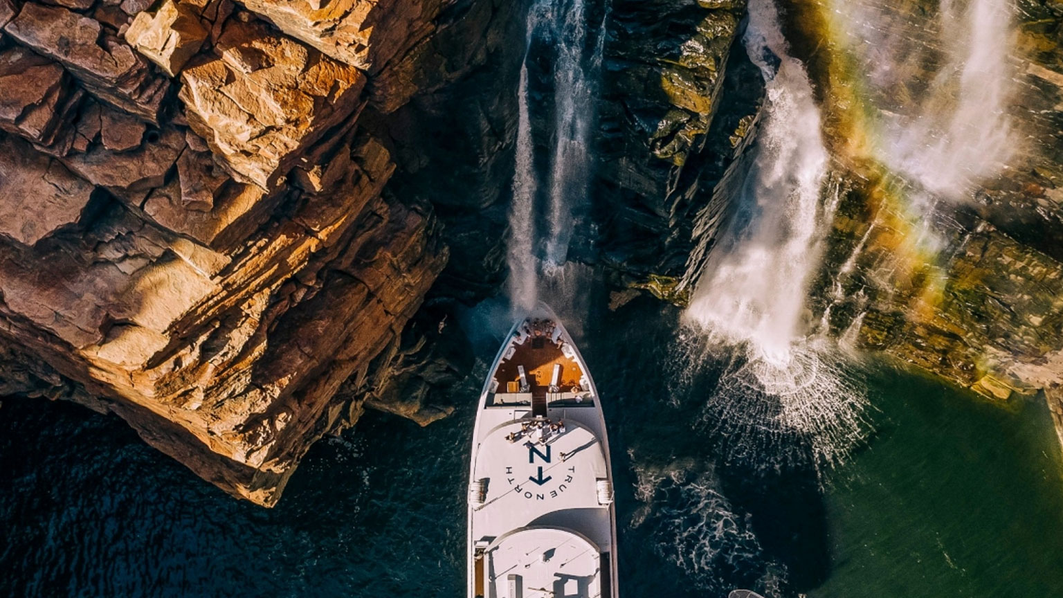 西澳大利亚州的金伯利(Kimberley)地区遍布崎岖的海岸线、高耸的锈红色砂岩悬崖和隐秘的海湾。由于海岸线未通公路,因此乘船是探访此地的唯一方式,搭乘游轮游览,你将饱览该地区闻名遐迩的古老岩画、隐秘瀑布和丰富的野生动物。其中一项出众的体验活动是乘观光飞机飞越水平瀑布(Horizontal Falls),强大的潮汐流奔涌穿过狭窄峡谷时,就形成了“瀑布”。