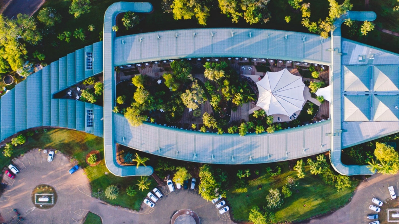 北领地,俯瞰贾比鲁美居卡卡杜鳄鱼酒店和周边的植被和建筑 © 北领地旅游局/Salty Wings 版权所有