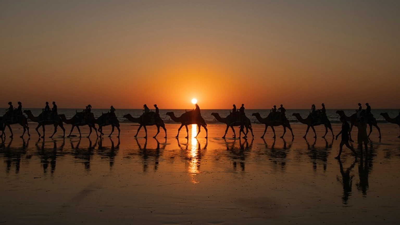 骑骆驼漫步凯布尔海滩是布鲁姆最具标志性的体验之一。橘红色的落日余晖中,一支悠然前行在沙滩上的骆驼队,这幅唯美的画面早已成为布鲁姆的一张亮丽名片。