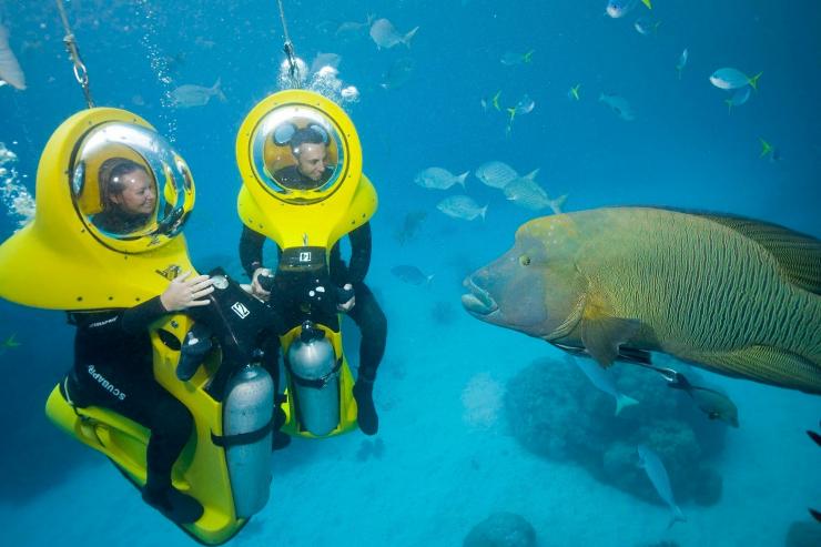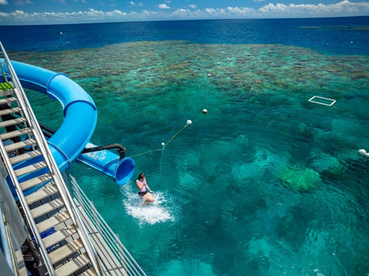 摩尔礁(Moore Reef)海面上漂浮着“太阳恋人号”(Sunlover)游轮,配有螺旋形水滑道。这趟外礁之旅是一个套餐项目,包含浮潜和乘坐玻璃底船等各种活动,非常适合与家人或好友一起体验。