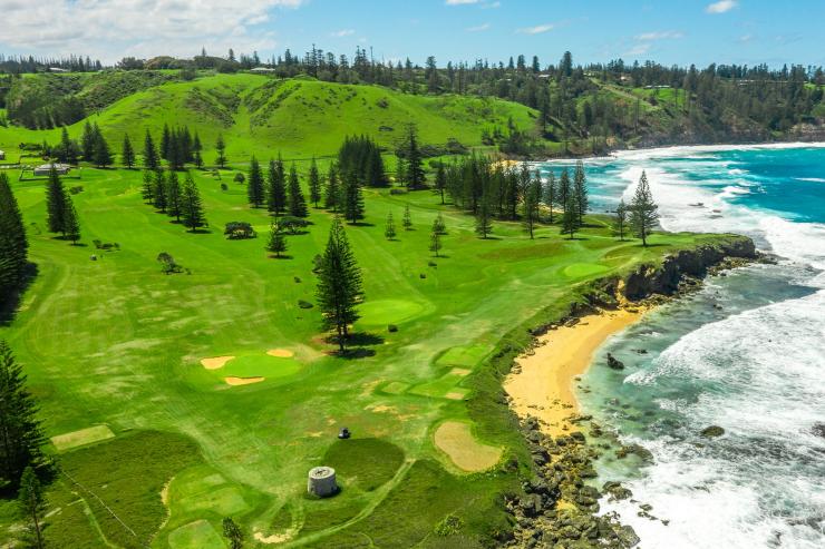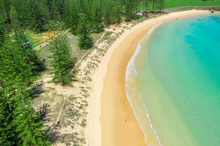 穿过壮观的新月形金色沙滩,潜入艾米丽湾潟湖(Emily Bay Lagoon)清澈见底的海水,在珊瑚和海洋生物丛中畅游,在沙滩的另一边,草地绵延广阔,诺福克松树林(Norfolk Pines)郁郁葱葱,好一幅色彩分明的画面。