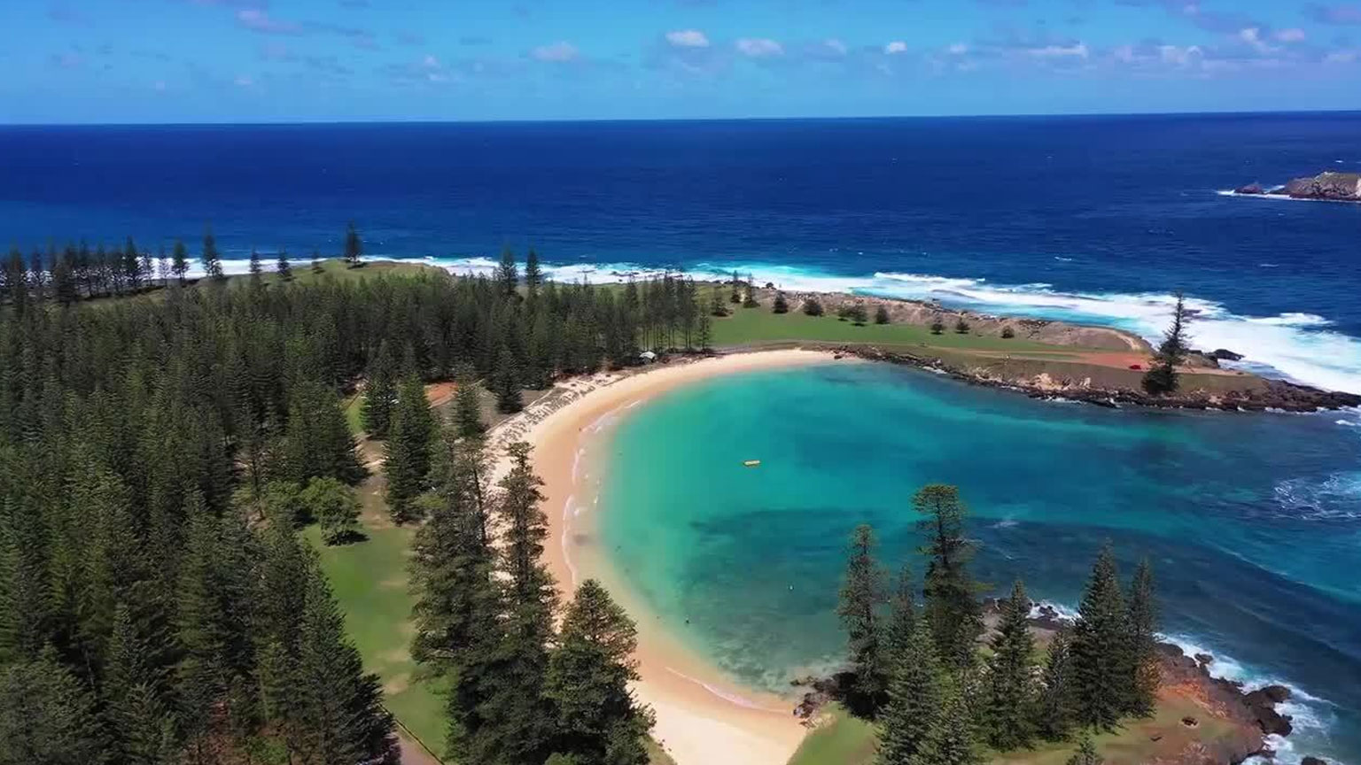穿过壮观的新月形金色沙滩,潜入艾米丽湾潟湖(Emily Bay Lagoon)清澈见底的海水,在珊瑚和海洋生物丛中畅游,在沙滩的另一边,草地绵延广阔,诺福克松树林(Norfolk Pines)郁郁葱葱,好一幅色彩分明的画面。