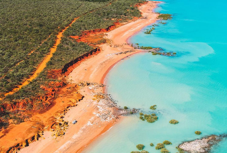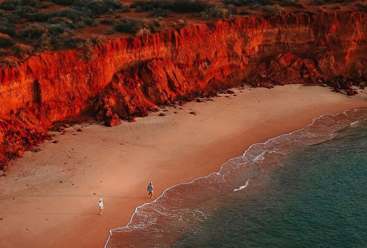 “前往佩伦角(Cape Peron)的路途十分艰险 —— 你需要四驱车。我最近一次前往那里是在原住民向导 Darren Capewell 的陪同下,我们驱车驶过了一段崎岖不平但风景优美的道路,穿越弗朗索瓦佩伦国家公园(Francois Peron National Park),来到该岬角。风景豁然开朗,眼前是辽阔的红土地、高耸的悬崖、白色的沙滩,以及蔚蓝的大海。这一切以最美轮美奂的方式呈现在你眼前。